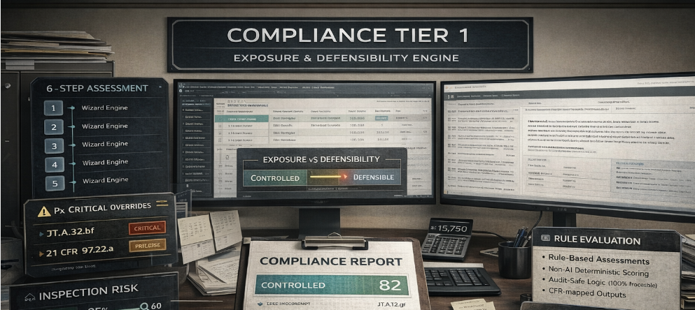 Exposure & Defensibility Engine that evaluates facility compliance using deterministic scoring, rule-based evaluation, and CFR-mapped outputs.